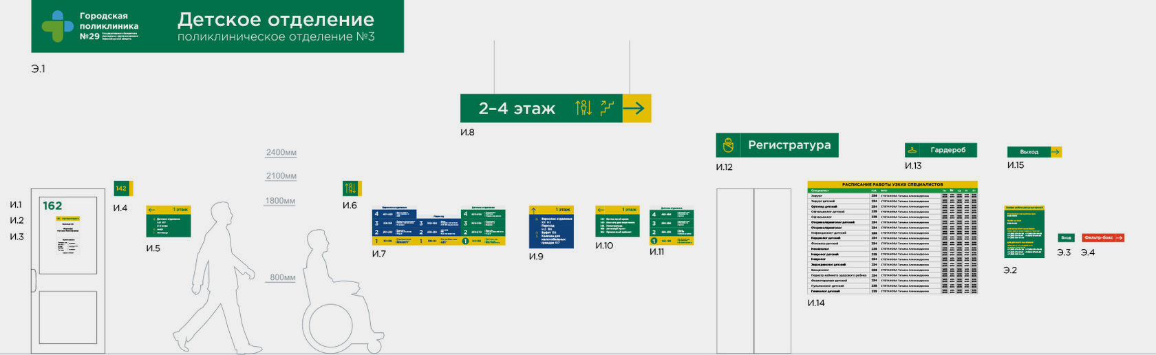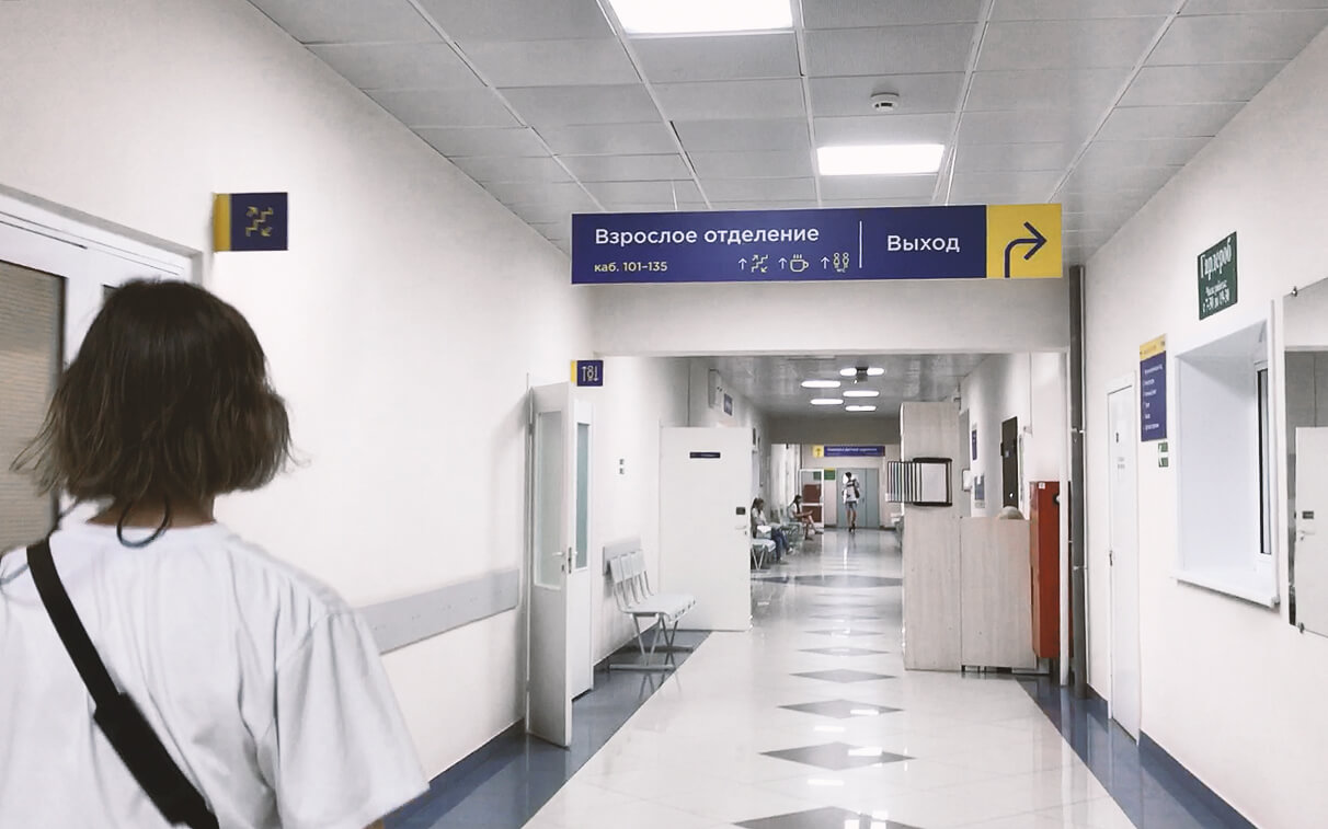 Создать систему визуальной навигации, которая будет удобна и понятна как для взрослых, так и для детей, посещающих поликлинику. Задача включала анализ поведения посетителей и разработку навигационных решений, способствующих быстрому и интуитивному ориентированию в пространстве.
